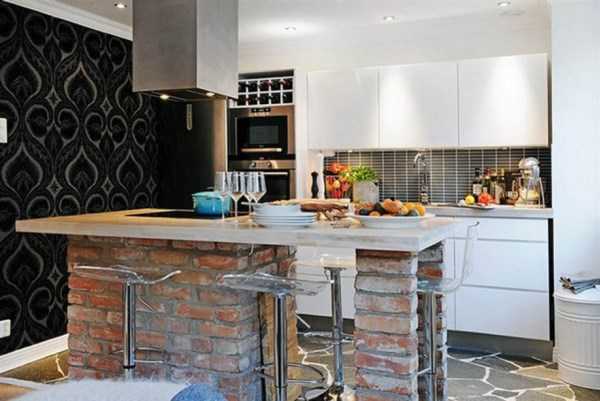 Обеденную зону можно выделить, установив в комнате барную стойку. Барная стойка, которую можно использовать в качестве стола – это отличное решение для молодой пары. Если в гости придут несколько человек, они вполне смогут разместиться за стойкой.