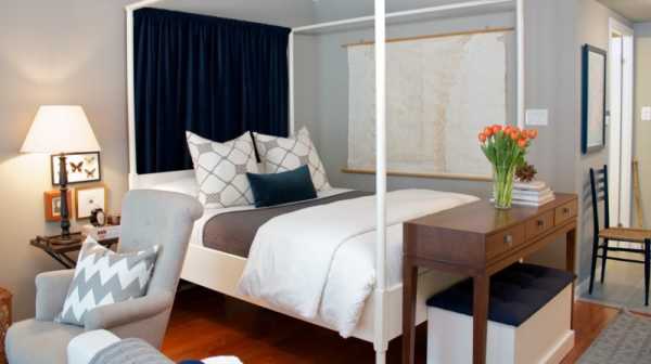 Поделить комнату на зоны помогут предметы мебели. Поставьте кровать в одной части помещения (спальное место можно оборудовать в нише), а рабочий стол в другой.
