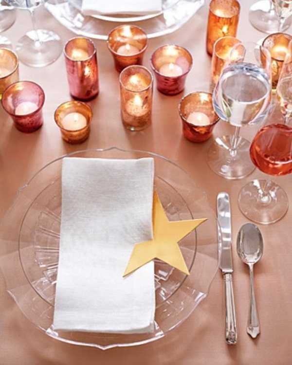 Отличным дополнением станут подсвечники. Если это массивный канделябр, то пусть он будет один на стол, а если это мелкие аквариумы с плавающей свечой, то установите их два на столе. Идеальными будут светящиеся домики из мозаичного стекла, внутри которых зажжена свеча.