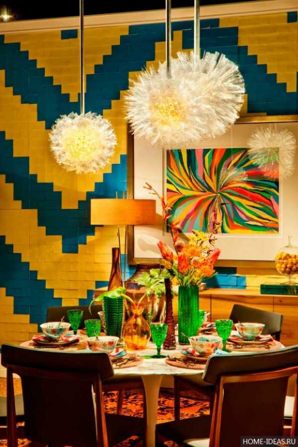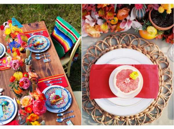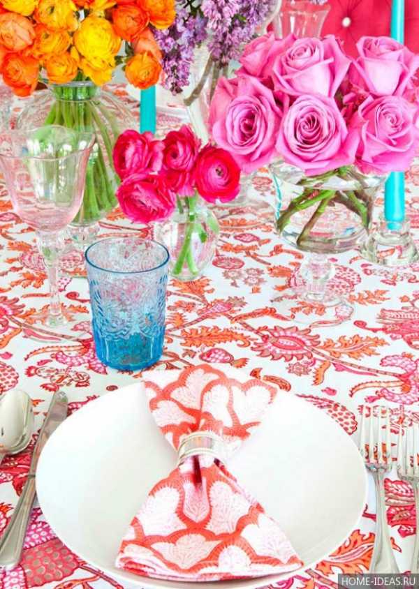 Когда нет строгих требований к церемонии и дресс-кода, центральной темой оформления праздничного стола можно сделать пестрые узоры в столовом текстиле и яркие цвета букетов
