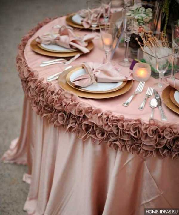 Важно обратить внимание, чтобы все примененный атрибуты гармонировали. Максимально подходящим вариантом станет одноцветная большая скатерть, поскольку она сможет гармонично подойти к практически любым вашим стилистическим решениям. Когда нужно добиться максимально торжественного вида, нужно использовать шелковые ленточки.