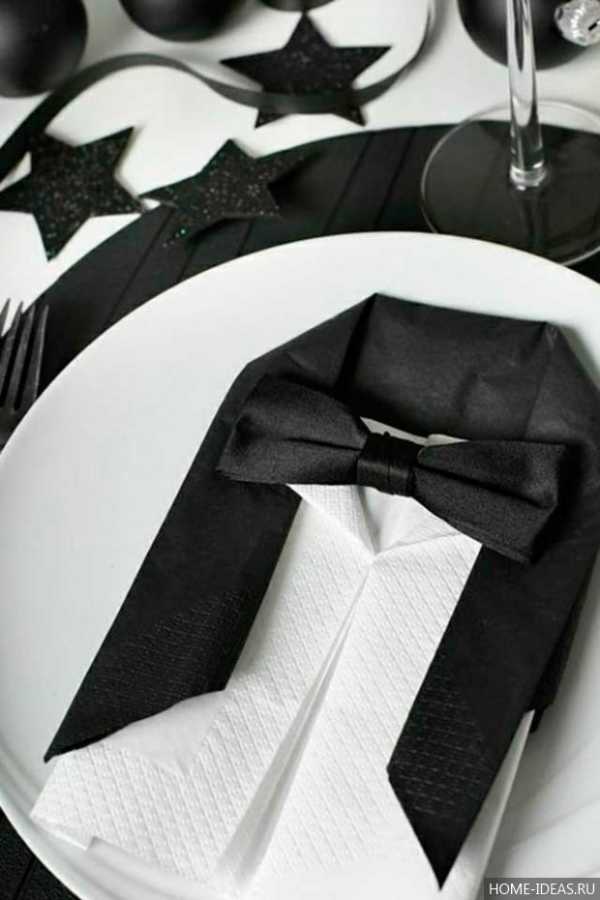 Бумажные салфетки могут стать настоящим произведением искусства на вашем столе. Рулончики, веера, треугольники – бесконечное множество способов уложить салфетку на тарелку. Сложите салфетку в прямоугольник и перетяните посередине лентой. У вас получится великолепный галстук-бабочка. Расположите его в центре тарелки. Красиво смотрится игра цветов в этом случае. Берите салфетку такого же цвета, как и контур тарелки. Сервировка праздничного стола – это поле для творческой фантазии и креативности хозяйки дома.