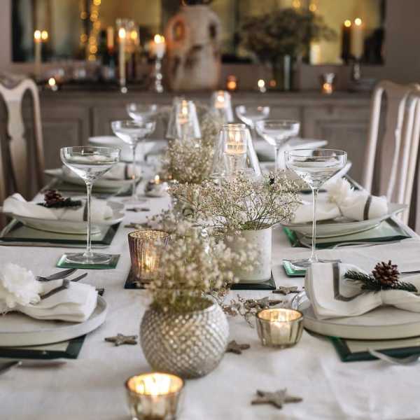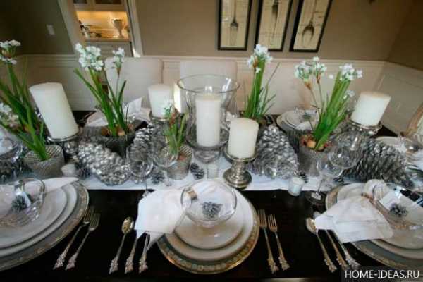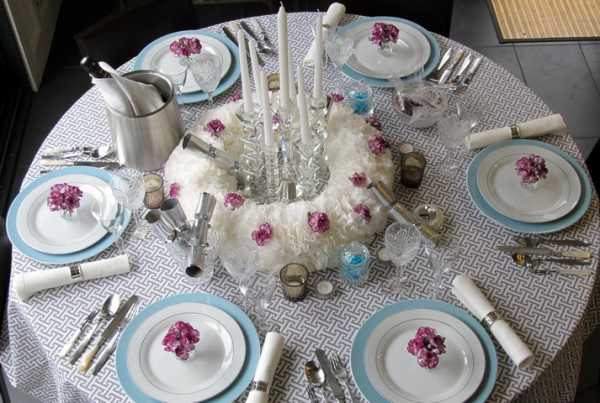 Также можно разместить на столе и несколько красивых букетов, но они должны быть в хрустальных вазах, чтобы вписываться в общий дизайн праздничного стола. Что касательно фарфоровой посуды, то вот к ней выбрать подходящее полотно предельно просто, так как на нем будут гармонично смотреться практически любые аксессуары.