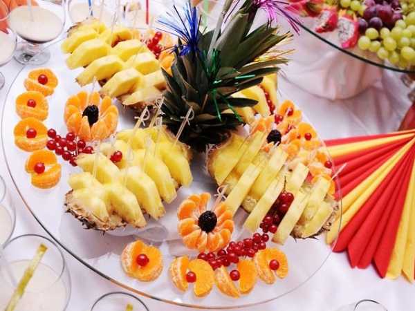 Фруктовая нарезка является еще одним важным компонентом праздничного стола, так как фрукты отлично подойдут в качестве легкой закуски. При оформлении фруктовой нарезки следуют помнить несколько важных правил. Во-первых, для нарезки нужно выбирать только свежие фрукты правильной формы. Во-вторых, готовить фруктовую нарезку необходимо непосредственно перед приходом гостей. В-третьих, чтобы фрукты не почернели, их нужно немного сбрызнуть лимонным соком, а для нарезки используйте только острый нож. Оформить фруктовую нарезку можно самыми разнообразными способами, которые зависят только от Вашей фантазии.