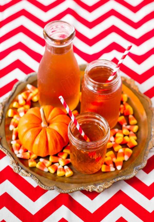 Осенний декор чайного стола часто делают из лакомств: мед, сиропы, морс, маленькие тыквы и другое