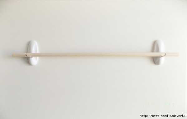 Разрежьте нить на 10 частей по 1 м. Прикрепите узлом на лицевой стороне работы на палочку. Закрепите кончики палочки к рабочей поверхности изолентой.