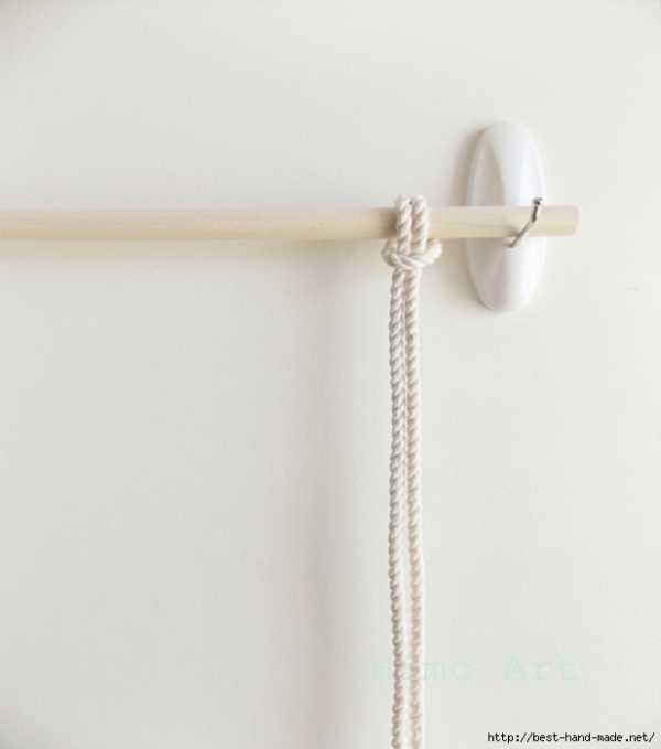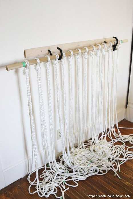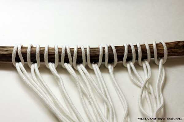 Нарезаем веревку на 16 частей по 3.5 м. Складываем посредине и привязываем к планке, закрепляя веревку узелком впереди. Не забываем на планку еще привязать одну короткую веревку для подвеса. Она не будет принимать участие в плетении.