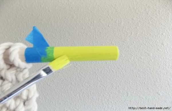 Закончив работу, отпарьте сову. Покрасьте палочки при желании, смещая сову в сторону. Подрежьте параллельно хвосту нити под углом.