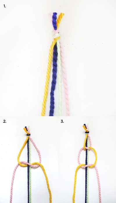 Работая с первыми двумя нитями, используя их как основу, выполняйте петельные узлы, поочередно работая каждой из следующих 8 нитей.