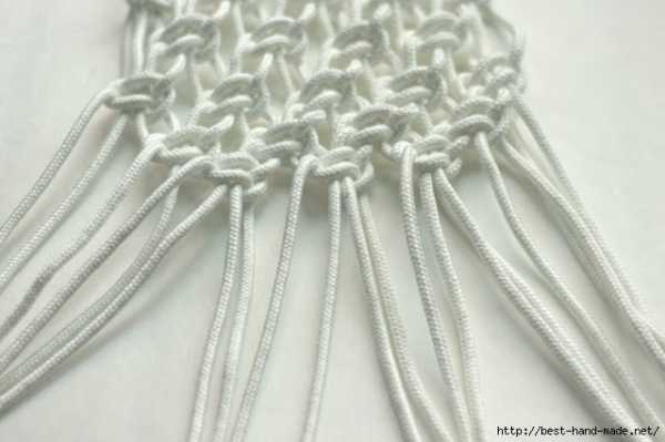 Плетем «шахматку» из двойных плоских узлов на 8 средних нитях, захватывая по паре нитей от крайнего узла предыдущего ряда с каждой стороны.