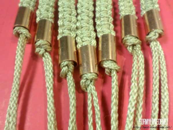 В конце работы плетем простые двойные плоские узлы на 4 нитях, увеличивая постепенно их количество.