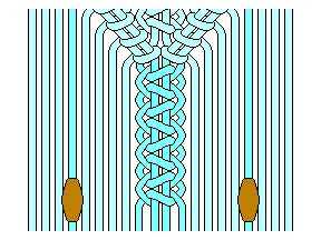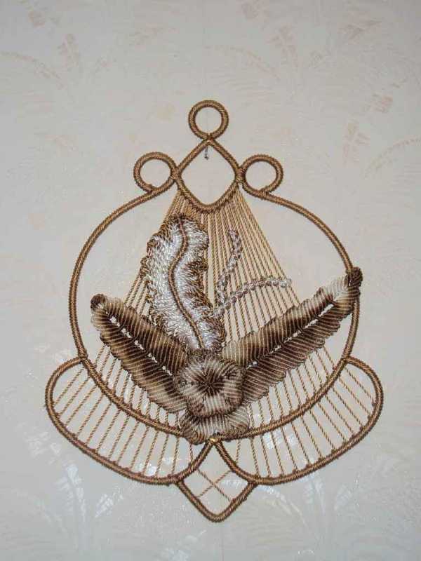 К дополнительной нити (горизонтальной) приплетаются все 40 нитей с помощью репсовых узлов. Затем их следует разделить на 10 цепочек (по 4 нити каждая) и сделать в каждой по 3 двойных плоских узла Остается украсить боковые части панно мережкой, и связать их концы в один пучок, а затем красиво прикрепить его к бридам.