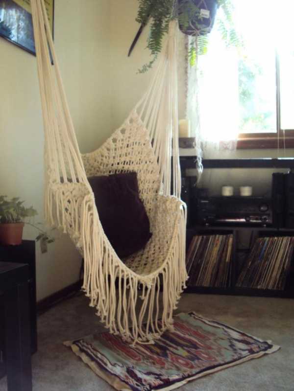 Очень по-девичьи смотрятся ширмы, украшенные ажурным плетением. Такой изысканный аксессуар станет прекрасным дополнением к стандартным предметам мебели в спальне. Макраме – это ещё и способ для создания разнообразных гамаков и подвесных кресел.
