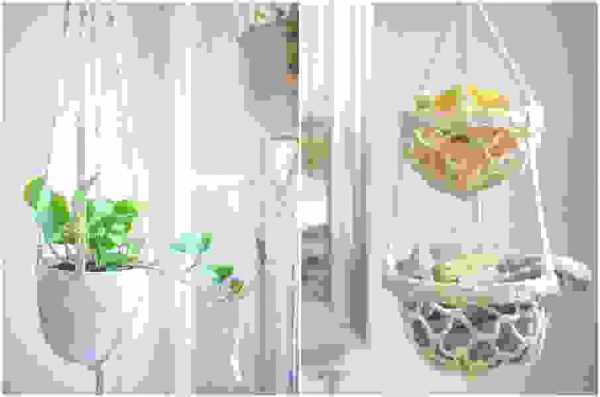 Интерьеры в стиле бохо не обходятся без многочисленных вязаных кашпо для растений.