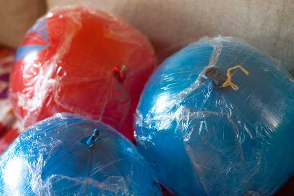 Надутый шарик заворачиваем в пищевую пленку. Хвостик я оставляла незакрытым, чтобы потом было удобнее сдувать шарики. Да, я их не прокалывала, а сдувала, так как если делать все аккуратно, то резиновый шарик сможет прослужить нам не раз и не два 🙂