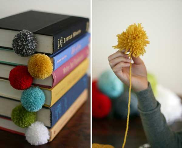 Еще одним интересным изделием из нитей является закладка для книги. Пушистые помпоны из мулине даже самую умную энциклопедию превратят в веселый мерцающий светофор.