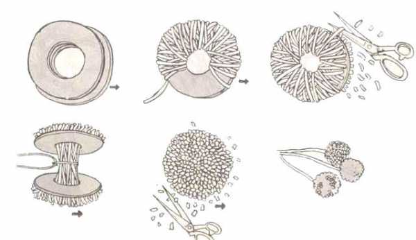 Подробно о том, как изготовить помпон из ниток, можно прочитать в статье «Фрукты-помпоны из ниток», а я предлагаю Тебе посмотреть схему. Уверен, разобраться в ней Тебе будет очень просто, и теперь нужна страница никогда не потеряется.