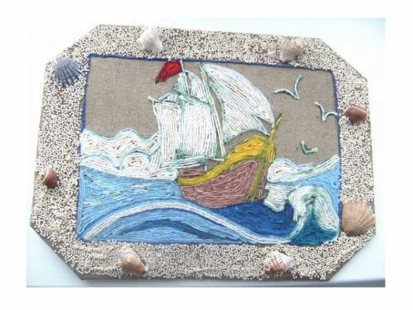 Оказывается, из нитей можно создавать не только объемные изделия, но и потрясающе красивые аппликации. Цветные нити, отрезок полотна, клей, небольшие ракушки, картон, мелкая крупа— и у Тебя на стене «белеет парус одинокий».