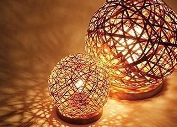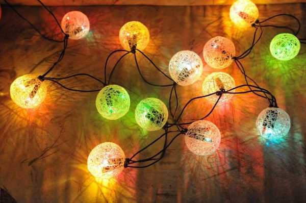 Изготовить такие абажуры совсем не сложно: надуй шарик небольшого размера, обмотай его нитками, смазанными клеем, дай высохнуть. Лопни шарик и надень маленькие абажуры на лампочки обычной гирлянды. Наслаждайся цветным праздником!