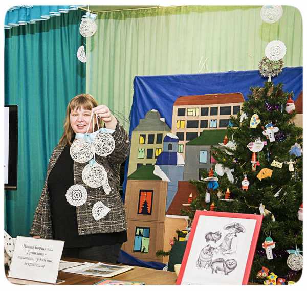 После этого можно и задекорировать шары из ниток. Я украсила их атласным бантом, а снизу на леске привязала ажурную снежинку. Связка моих шаров была подарена Нонне Ермиловой, которая приезжала к нам в библиотеку на творческую встречу.