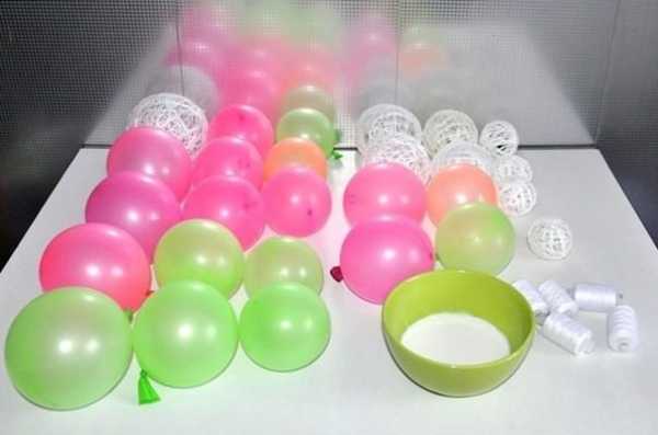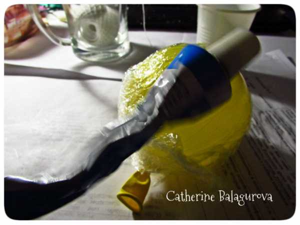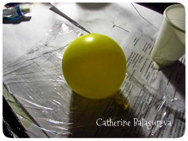 Берем обычный резиновый шарик, надуваем до нужного нам размера. У меня был конвейер, поэтому я надувала сразу штук 6-7. Хорошенько стяните пимпку, чтобы шарик не сдулся при сушке, иначе вся конструкция перекосится 🙂
