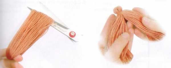 3. Чтобы сделать голову согните нити пополам, отрежьте небольшой кусок нити того же цвета и завяжите его вокруг пучка отрезанных нитей, чуть ниже сгиба.