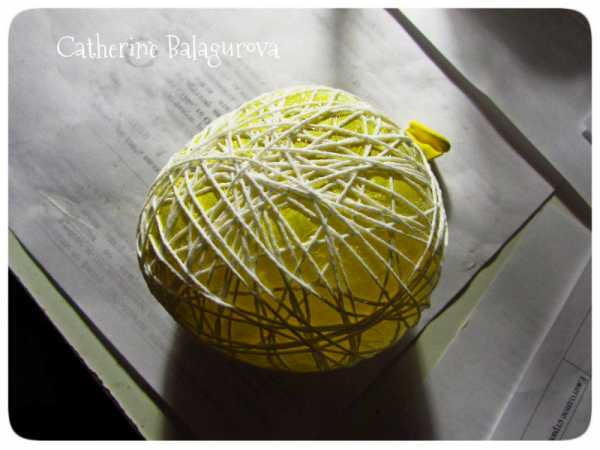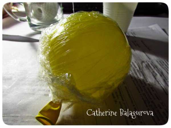 Благодаря пленке и вазелину, между ниток нет засохшей пленки от ПВА, как это иногда бывает, если делаешь такие шары из ниток по-другому, например, если сразу наматываешь нитки на шарик, без прослойки. Соблюдайте технологию и все у вас получится! 🙂