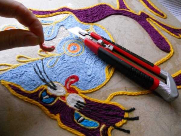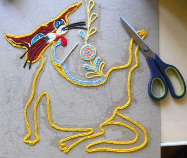 - Теперь приступайте к созданию картины. Для этого шаг за шагом выкладывайте нитки одного цвета на густо смазанный клеем участок рисунка.