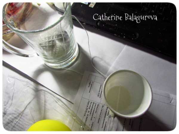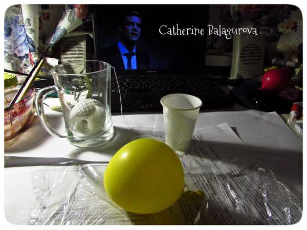 Теперь важный момент. Как подготовить нитку для обматывания. Чтобы нитка не запуталась и не была слишком влажная от клея, ее надо пропустить сквозь стаканчик с клеем. Создавая первый шар из ниток, я нитки клала в миску с клеем, то есть попросту окунала их туда. Нитки были слишком мокрые, постоянно путались и сворачивались в узелки. И, конечно, все кругом было в клее 🙂 Клея было больше на руках, чем на нитках 🙂 Поэтому я взяла пластиковый одноразовый стаканчик, шилом с двух сторон (ближе к низу, но не совсем низко) сделала две дырочки и пропустила сквозь них нитку. Потом налила клей ПВА, чтобы он закрывал нитку. На фотографии видно, как нитка проходит сквозь стакан. Такая система позволяет нитке не запутываться, впитывать клея столько сколько нужно. Сам клубок поместила в большую кружку, чтобы он не скакал по столу 🙂