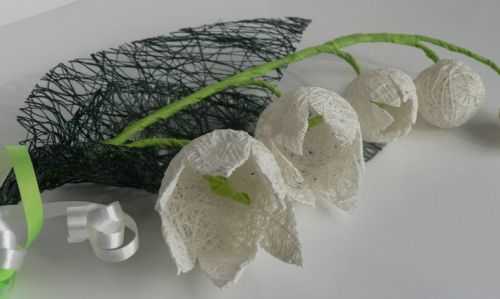 - Аккуратно проденьте проволоку в эти бутончики и закрепите на ней каждый колокольчик, украсив место крепежа бусинками.
