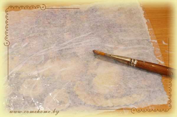 6. Замачиваем кальку в воде, затем вытаскиваем, кладем лицом на файл, промакиваем лишнюю воду, мажем клеем для декупажа.