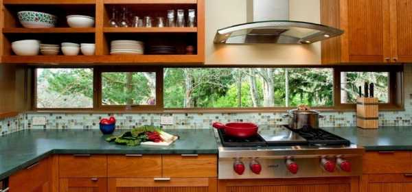 Из новейших достижений также следует отметить столешницы из закаленного стекла, которые совмещают одновременно прочность и изящество. Цвет такой поверхности можно выбрать абсолютно любой, максимально точно вписав его в интерьер кухни.