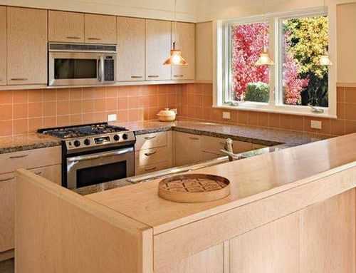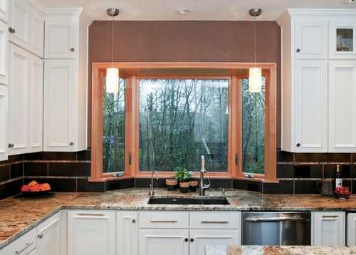 Очень эффектно выглядят кухни с окном в рабочей зоне. На месте бывшего подоконника делают столешницу, которая заменяет рабочую поверхность или служит местом для перекуса. Если она модифицируется в барную стойку, будет целесообразно убрать нижнюю полку, чтобы освободить место для ног для комфортного сидения. Вместо барных стульев лучше приобрести табуреты, которые легко задвигаются под столешницу и не занимают много места. Гарнитур может располагаться по бокам в виде буквы П. Такая кухня с рабочей зоной у окна должна быть квадратной формы, поскольку в продолговатом помещении проход будет достаточно узким. Расстояние между боковинами гарнитура должно быть не менее 1–1,2 метра. У окна на кухне также можно поставить мойку – тогда появится возможность любоваться видом из окна, не отрываясь от работы.