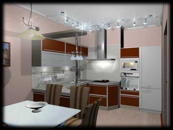 Существует достаточно много различных вариантов освещения рабочей зоны на кухне. Например, практичное решение – это точечные светильники на потолке, располагающиеся по периметру рабочей зоны. Еще можно на потолке сделать короб из гипсокартона, повторяющий расположение навесных шкафов, и в него вмонтировать светильники.
