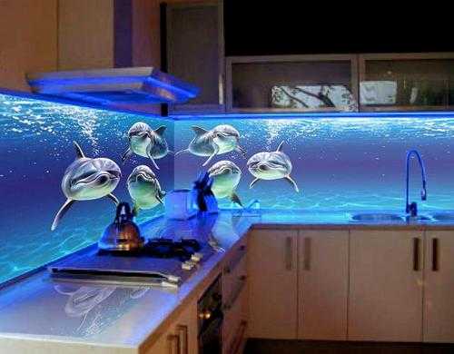 Длина стеклянной панели может быть до 3-х метров, но если вы хотите закрыть большую часть стены, то придется совмещать 2-3 панели и герметично закрывать стыки. Зато вся рабочая стена на кухне под навесными шкафчиками будет иметь оригинальный вид. А если вы еще организуете там светодиодную подсветку, то аквариум «оживет» у вас на глазах, в ярких красках рисуя удивительный подводный мир.
