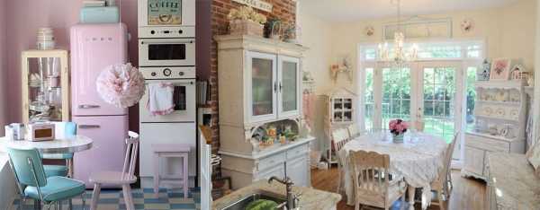 Кухни в стиле ретро существуют в двух различных вариантах. Первый — это романтичная кухня, наполненная украшенными шкафчиками и занавесками в цветочек. Кирпичная стена или камин (пусть даже декоративный) наполнят помещение еще большим уютом. Цветовая гамма — пастельная: светло-голубой, светло-зеленый, белый, розовый. В качестве контраста можно использовать красный цвет.