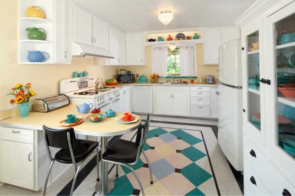 50-е годы известны под забавным названием «десятилетие домохозяек». Забота о семье, посвящение себя дому не могли не коснуться и оформления интерьера. Кухонное помещение – святая святых любящей жены и образцовой матери и должна соответствовать своей идеальной хозяйке.