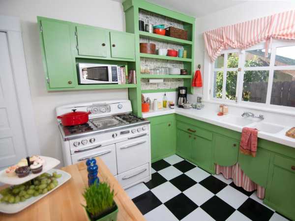 Вы решились на кухню в стиле ретро? Не думайте, что это связано с большими денежными затратами! Купите кухонные шкафчики с гладкими фасадами, постелите ретро-ковер в качестве акцента, повесьте рисунки на стены. Занавески, по цвету рифмующиеся с обстановкой, станут хорошим дополнением в интерьере. У вас уже есть старые шкафы? Отлично! Освежите их розовым или пастельно-зеленым цветом и получайте удовольствие от плодов своего труда.