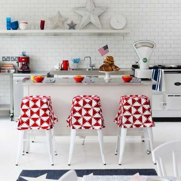 Фирменный стиль кухни а-ля 50-е воплощается в использовании цветного кафеля контрастных цветов, выложенного в шахматном порядке. Пол или рабочая зона, оформленные в подобном ключе, эффектно дополняются шторами похожей расцветки либо мягкой мебелью.