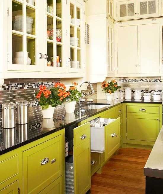 - Подберите столешницы контрастного оттенка к шкафчикам.