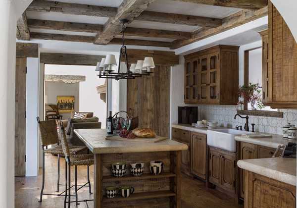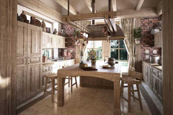 Его характеризуют просторные кухни, обставленные массивной деревянной мебелью с медными или чугунными ручками, большой многофункциональной плитой и столом внушительных размеров посередине.