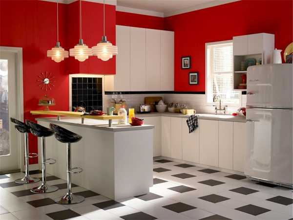 50-е – знаменитая эпоха рок-н-ролла иамериканских домохозяек. Нет, не отчаянных, а идеальных. Именно поэтому интерьер кухонь должен был быть полностью им под стать. Это не просто сочетание самых несочетаемых цветов, а также техника нарочито гигантских размеров, но и буйство самых безумных по конструкции гаджетов, призванных максимально облегчить для женщины процесс готовки. Очень часто на таких цветных кухнях можно встретить черно-белый или красно-белый кафельный пол.