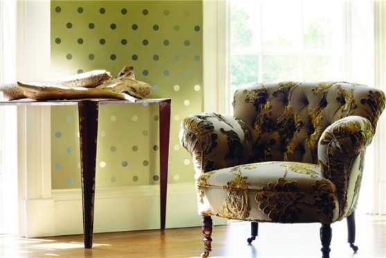 - Модные оливково-кремовые сочетания с принтом крупного гороха вполне уместны для винтажных интерьеров в дополнении с металлическими аксессуарами.