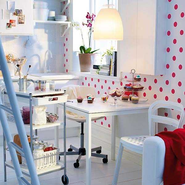 - Белый горох на красном или розовом фоне — традиционный яркий принт, используемый для небольших кухонь и детских комнат.