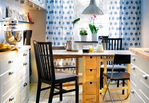 Хорошо будут смотреться шторы на вашей кухне из красной или синей ткани в белый мелкий горошек. К ним подбирается такая же обеденная скатерть и салфетки. Чтобы они не были в один тон, салфетки могут отличаться цветовой гаммой от штор и скатерти. К такому стилю неплохо было бы приобрести чайный сервиз в горошек.