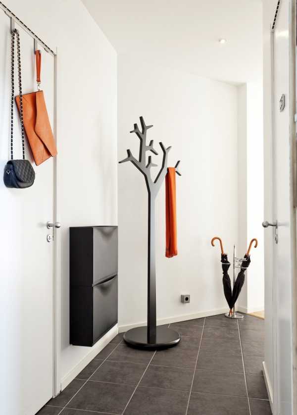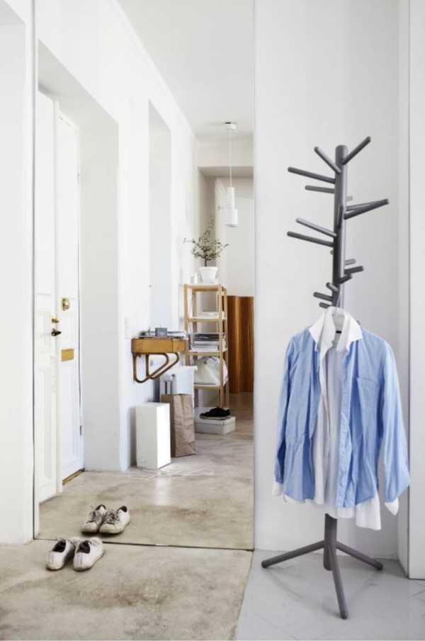 - Стильно смотрятся напольные вешалки для прихожей. Они занимают мало места, поэтому станут прекрасным решением для небольшого помещения.