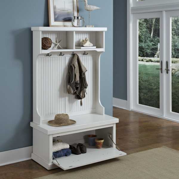 Вы не только повесите верхнюю одежду, уборы на вешалку, но и присядете на удобную тумбочку.