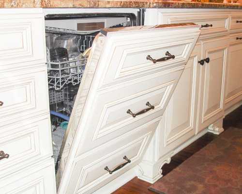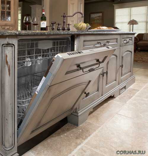 На фото видно, что посудомоечная машина спрятана за декоративным фасадом.