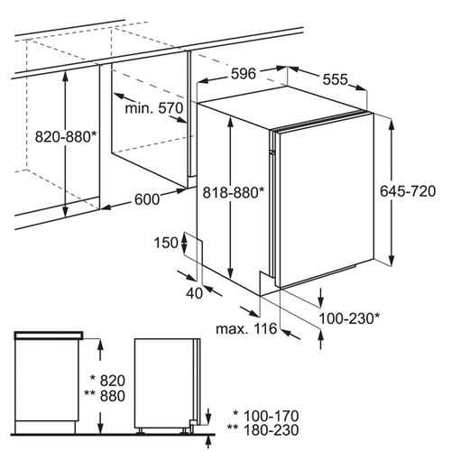 Подгон устройства по высоте осуществляется с помощью специальных ножек, которые можно отрегулировать и приспособить под столешницу. Необходимо отметить, что высота посудомоечной машины встраиваемой будет ниже на 20-30 мм, чем отдельностоящей. Это связано с отсутствием футляра (корпуса).