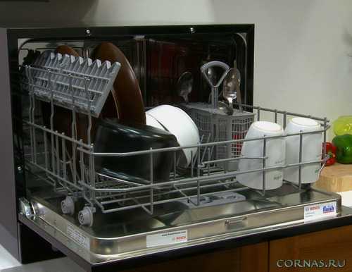 Компактная посудомоечная машина хороша только своими габаритными размерами, в нее поместится до 7 комплектов. Иногда в эти модели не входят даже большие тарелки.